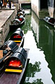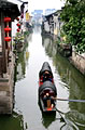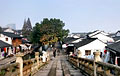 一条老街沿着河岸延伸,悠悠长长且直且弯。鳞次栉比的商店,青石板铺砌的路面从商店的屋檐或雨廊下通过,古老的水街一半在岸上,一半在河里,赶集的人们熙熙攘攘,一半在石板路上溜达,一半在脚划乌篷船里晃悠。